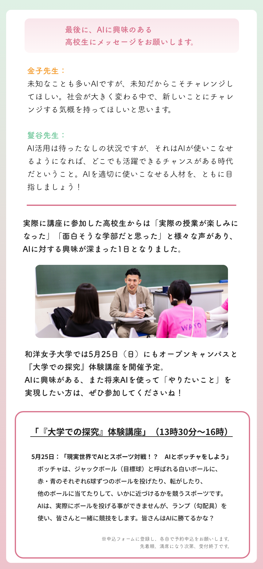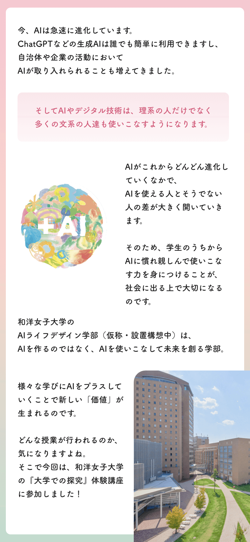 文系の人こそAI! AIを使いこなす力をつける新たな学部とは2025/04/24PRAIAIライフデザイン学部和洋女子大学学部ツイートオープンキャンパスの詳細はこちら 和洋女子大学 AIライフデザイン学部