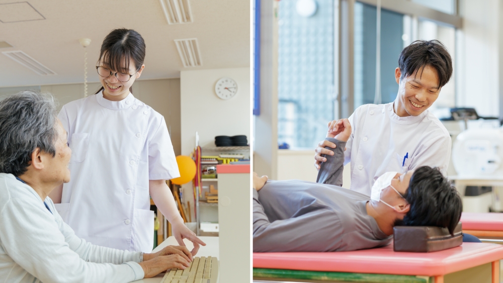 作業療法士とは、日常生活を送ることが難しい患者さんに対して、作業活動を通じて機能回復や社会参加を支援する仕事です。理学療法士とは、ケガや病気などで身体が思うように動かない患者さんに対し、立つ・歩く・座るといった基本的動作能力の回復や維持を支援する仕事です。