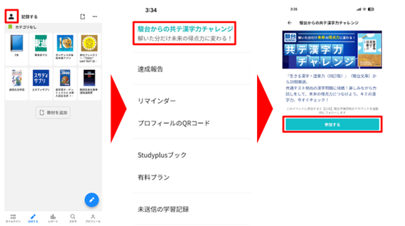 ③「参加する」をタップして漢字問題にクイズにチャレンジ!(自動的に駿台予備学校の公式アカウントのフォロワーになります)