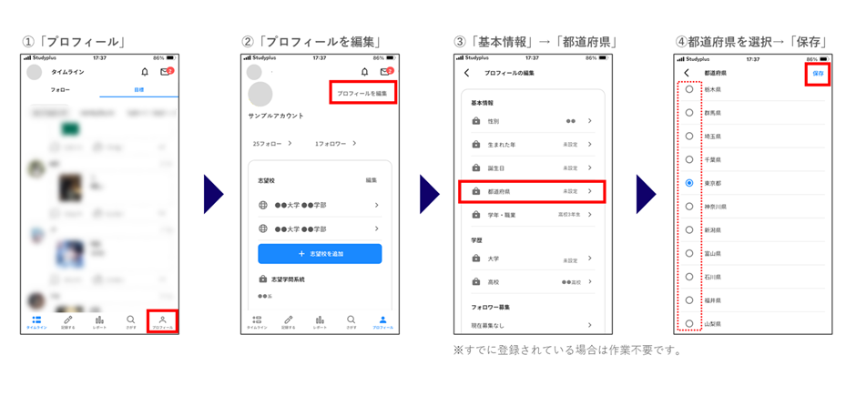 ⑤住んでいる都道府県を選択し、右上の「保存」をタップ