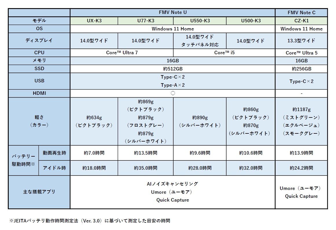 FMV Note Uシリーズは、世界最軽量※1のUX-K3だけでなく、U77-K3(約869g~)やU550-K3(約890g)など、いずれも900gを切る軽さです。このようにハイスペックでありながら軽さやインターフェースの豊富さといったモバイル性能の高さが大きな特長です。