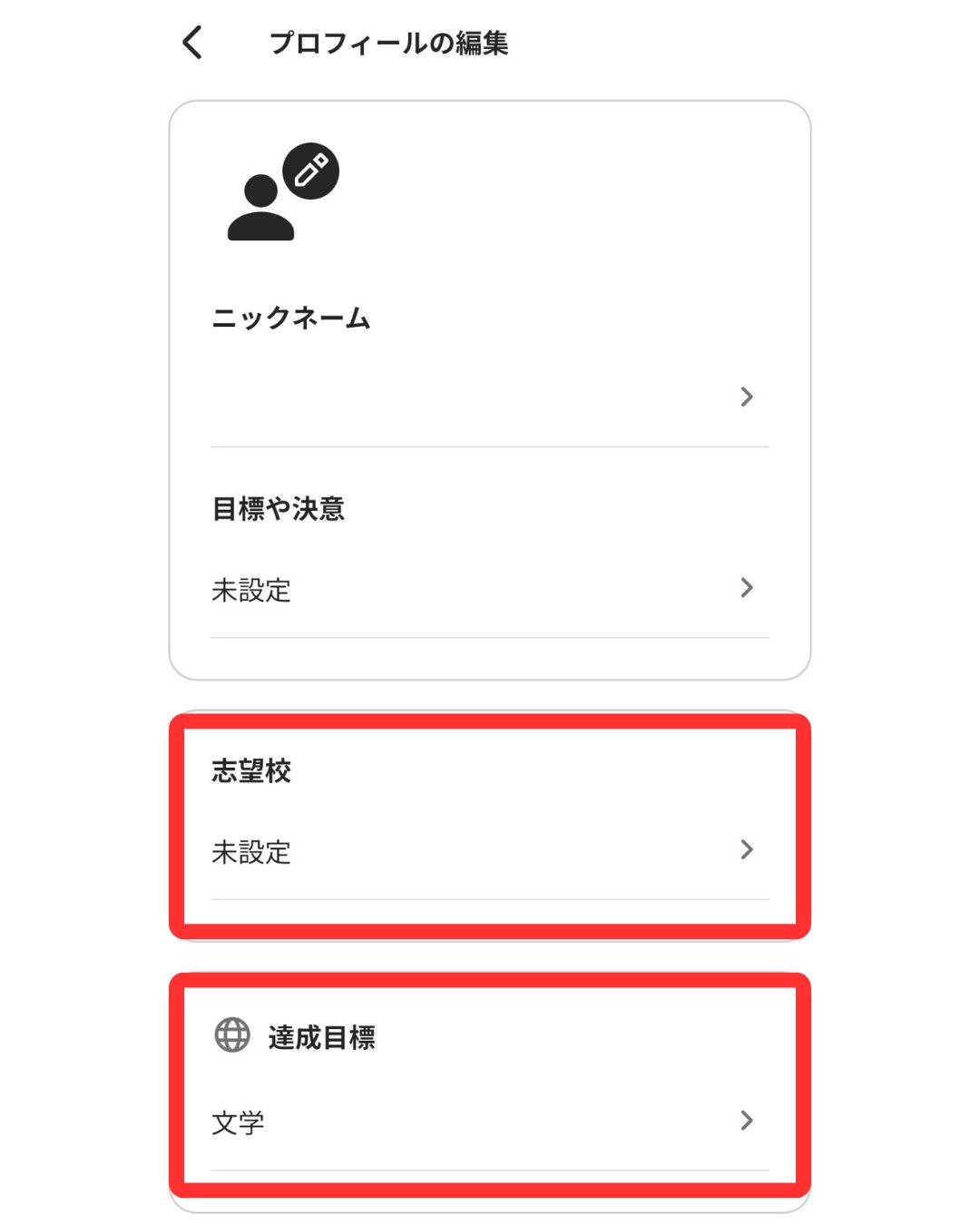 「マイページ」タブの「プロフィールを編集」を押すと、「志望校」と「達成目標」を編集することが可能です。公開範囲を自分で選べるので、気兼ねなく登録できます。