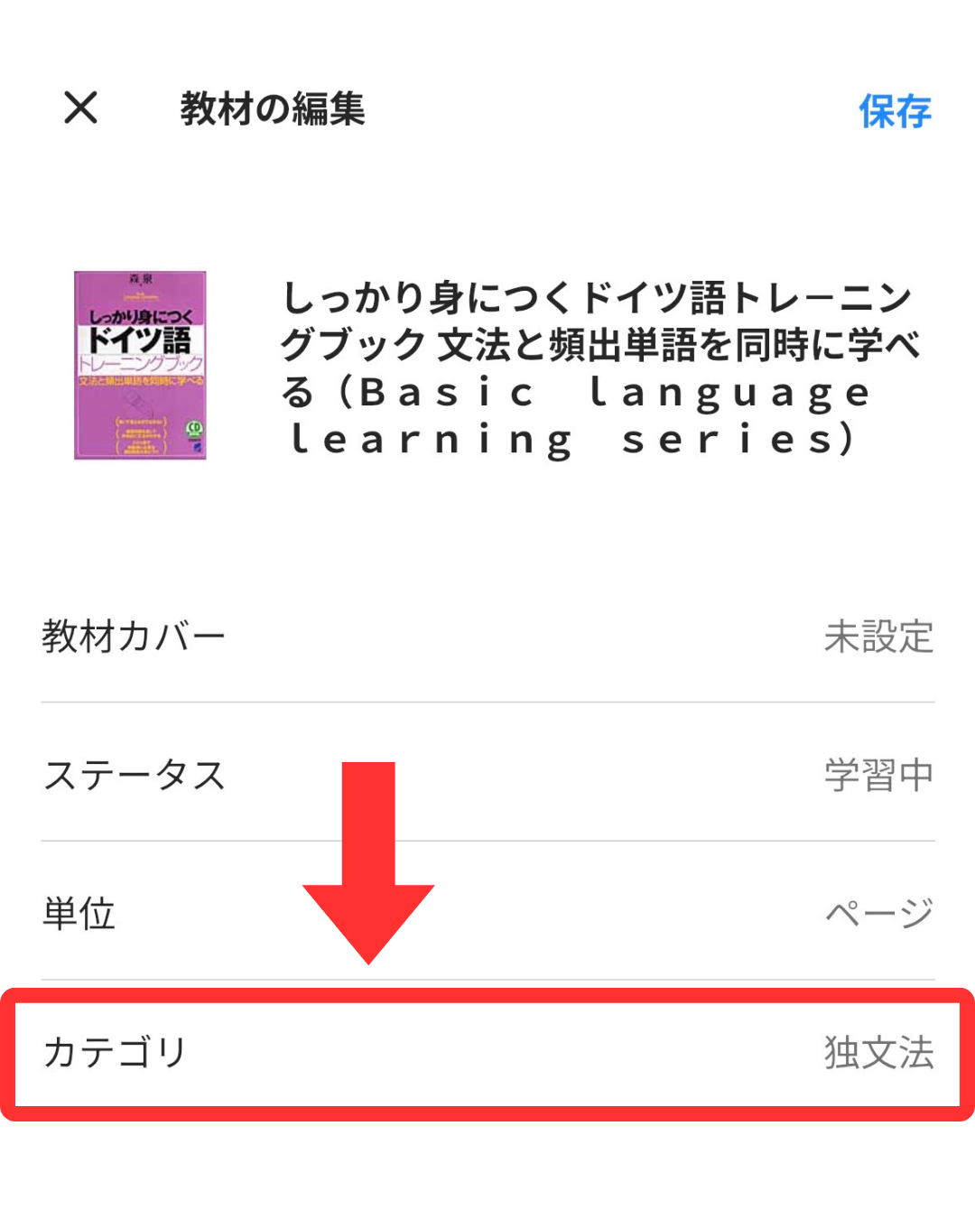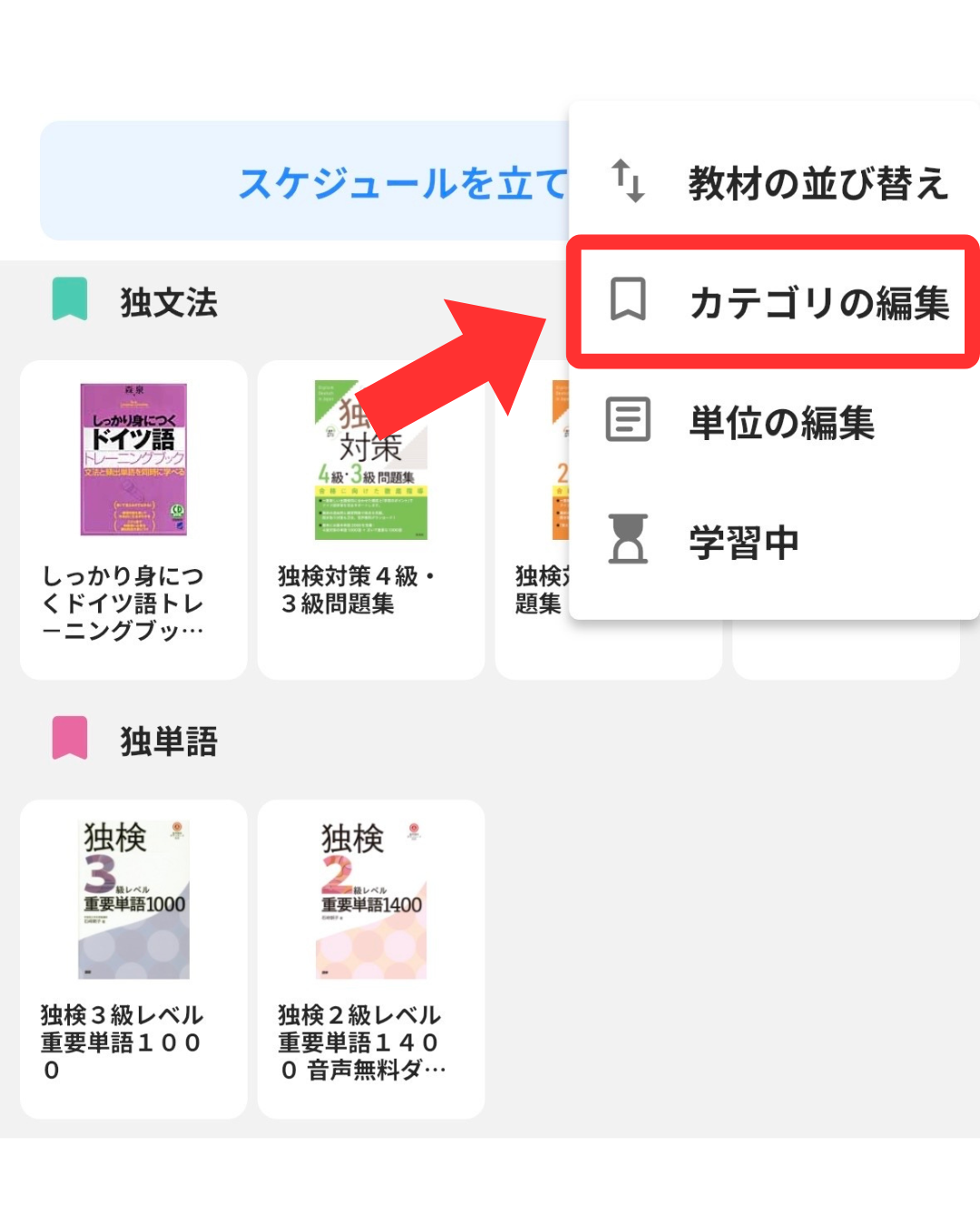 ステータスと同様に、教材を新しく設定する際か、既存の教材は「編集」からカテゴリの変更が可能です。