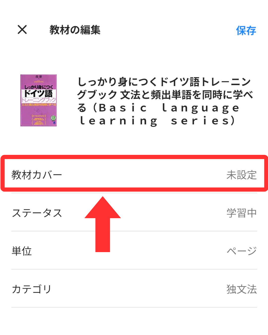 教材を設定すると、元々設定されている教材の画像がカバー画像として表示されますが、自分でカバー画像を設定することもできます!