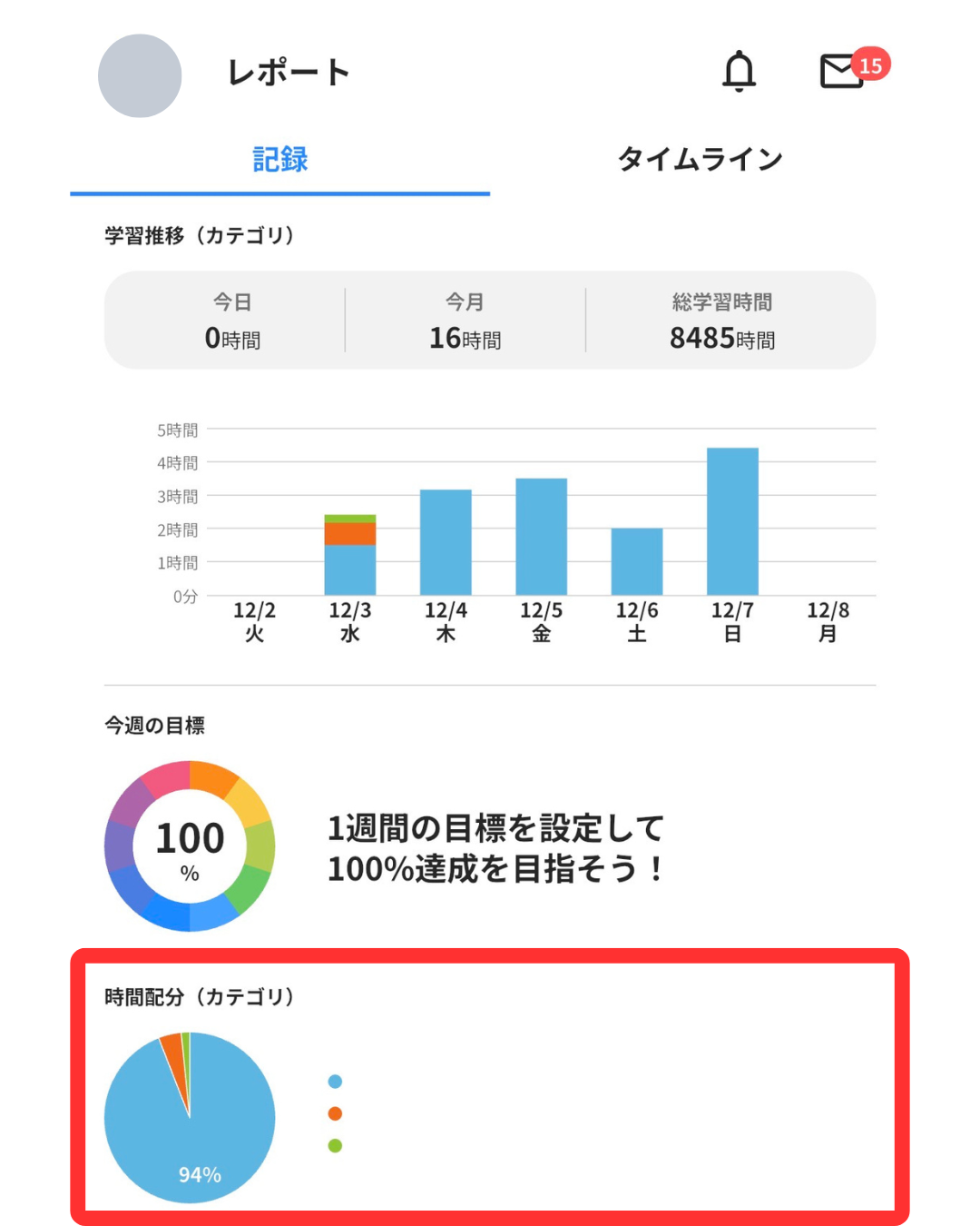「時間配分」の欄には、自分がつけた学習記録の配分が表示されます。こちらも、「日」「週」「月」を選ぶことができる他、表示も同様に「すべての教材」「すべてのカテゴリ」「カテゴリ名で絞る」を選択できます。