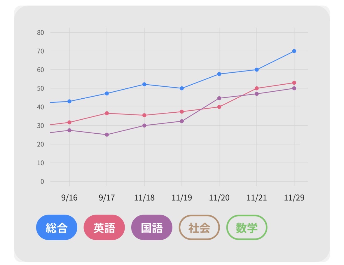 成績の変化を折れ線グラフで確認してみましょう。教科ごとにも確認可能なので、試験の振り返りや学習の振り返り、目標設定にぜひお役立てください。
