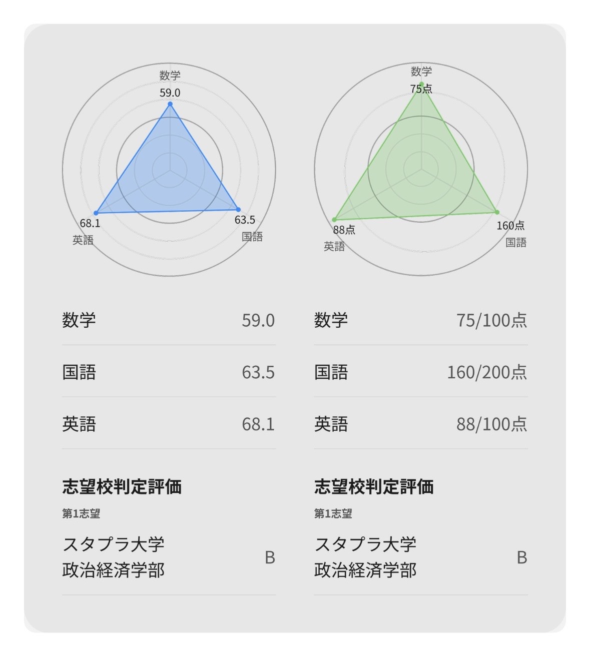 教科別チャートで、教科バランスを確認してみましょう。教科ごとの偏差値・得点でチャート表示されます。重点的に学習した方がいい教科を見つけたり、バランスを把握することで、成績向上への近道が見つかるかもしれません。