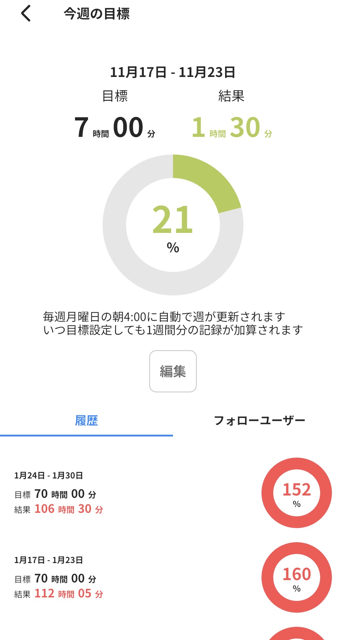 自分の過去の目標、フォローユーザーの先週の結果も確認できます!過去の自分や、同じ目標を掲げている仲間と比較して、自分の状況を客観的に把握したり、モチベーションにつなげるのにもいいかもしれません。