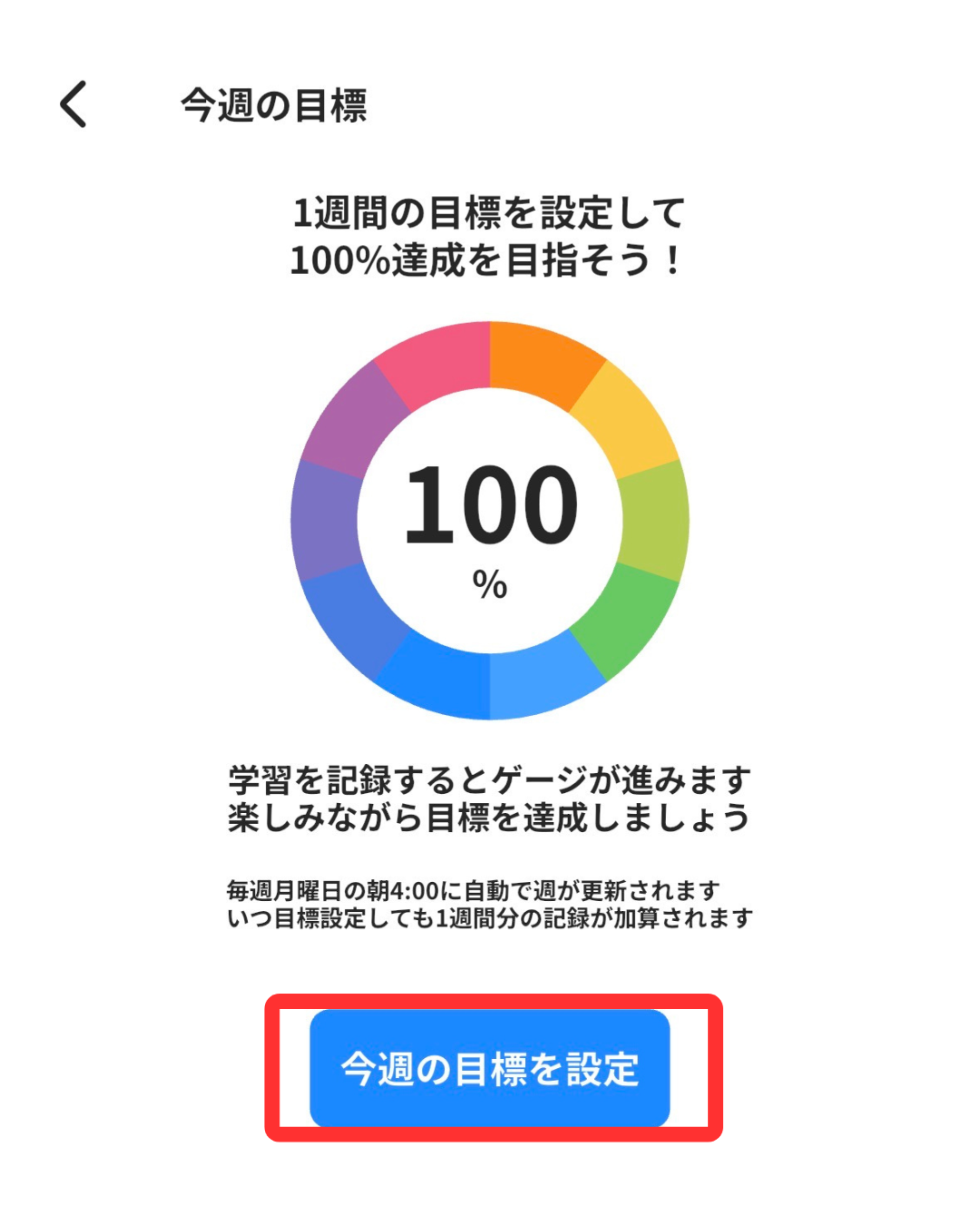 1週間の始まりは、月曜日に固定されており、週の途中で設定しても自動的に月曜始まりで集計されます。パーセンテージで都度の達成度を見られるので、学習ペースの確認に役立ちます。