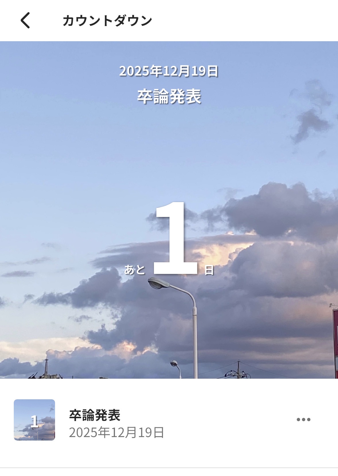 カウントダウン機能は、自分でイベントを設定するとそのイベントまで何日かがカウントされる機能です。「タイトル」「コメント」「日付」「背景画像」を自分で設定可能です。背景画像は、プリセットから選ぶこともできますが、自分の写真フォルダから選ぶこともできます!好きな画像に設定することで、モチベーションにもつながりそうです☺︎