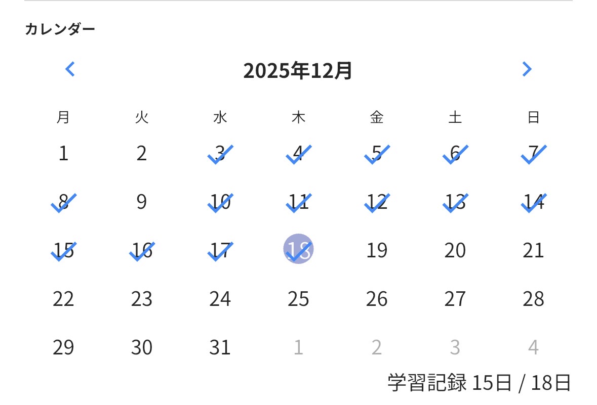 下には、何日中何日学習したかも表示されます。「毎日少しでも学習する!」という目標も大きな結果につながるかもしれません☺︎