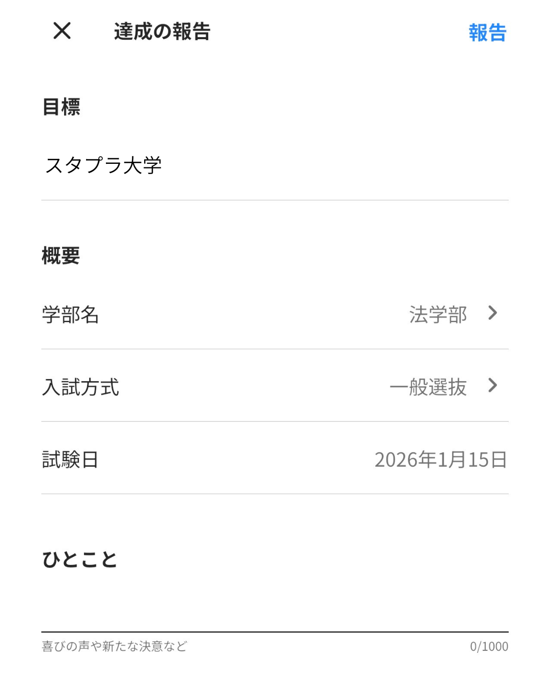 達成報告には、志望校であれば、「学部名・入試方式・試験日」が設定できます。検定等の目標であれば、「試験日・得点」を設定できます。