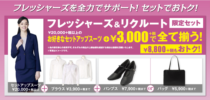 女性のセットは、スーツ、ブラウス、パンプス、バッグの4点。P.S.FAのスーツなら、美脚効果抜群のキレイアップスーツでスタイル良くみせることができます。スーツの形やスカートのシルエットなども好きなものから選べるので、自分のスタイルに合っているベーシックで長く使えるものを選びましょう!