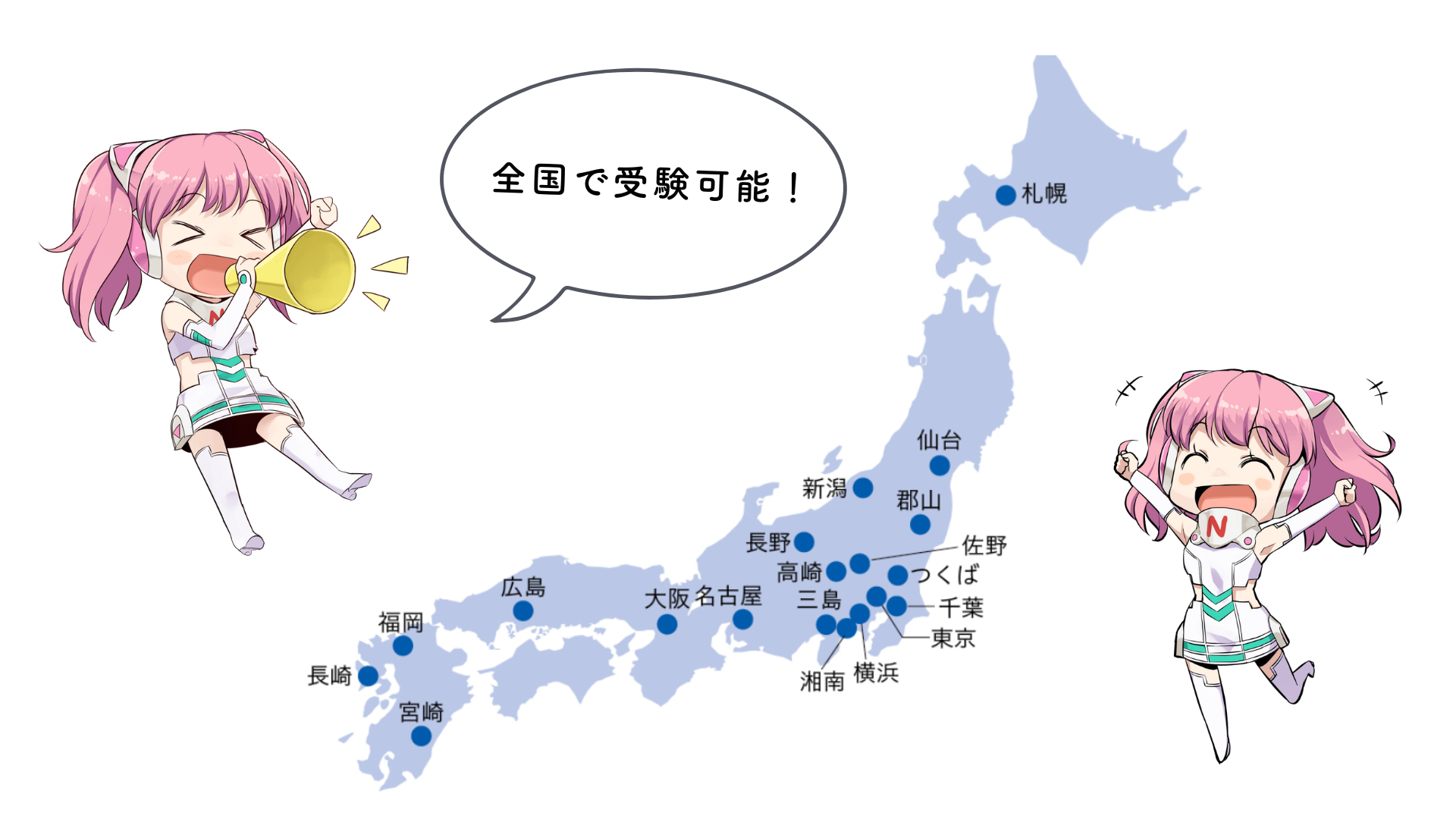 札幌/仙台/郡山/つくば/佐野/高崎/千葉/東京/横浜/湘南/新潟/長野/三島/名古屋/大阪/広島/福岡/長崎/宮崎
